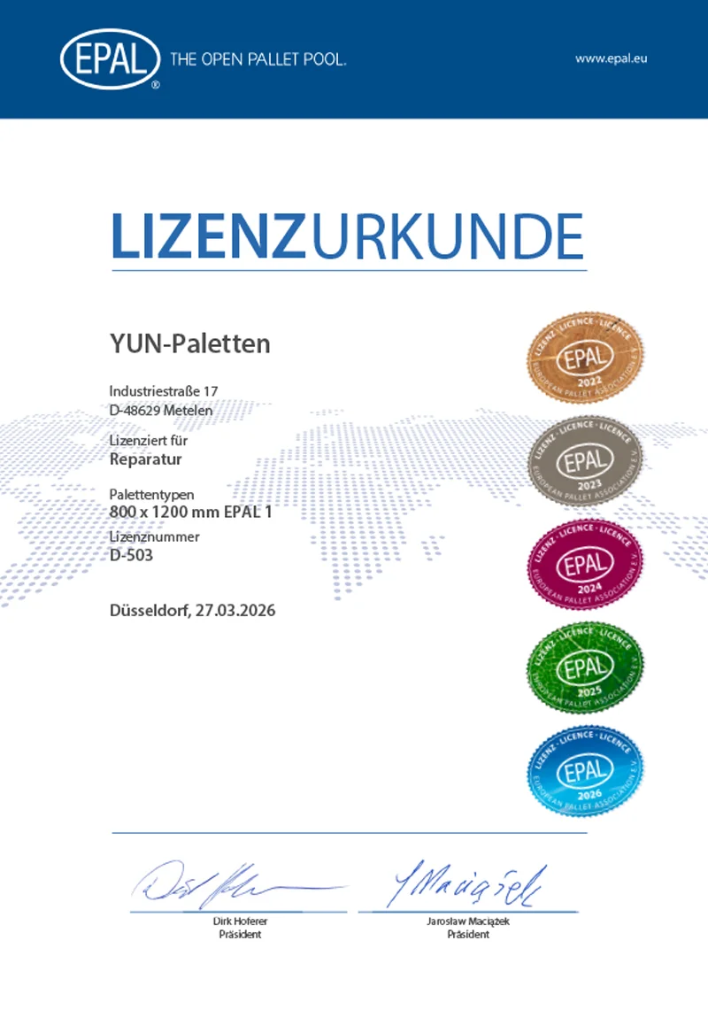 Bei YUN Paletten verbinden wir ökologisches Bewusstsein mit ökonomischer Effizienz. Unsere Firmenphilosophie basiert auf Nachhaltigkeit und Kundenzufriedenheit. Wir bieten nicht nur den An- und Verkauf von Paletten, sondern auch einen umfassenden Reparatur Service, Paletten Tausch und ein kostenfreies Paletten-Konto, um Ihre Logistikprozesse zu optimieren.